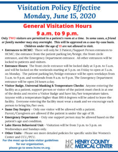PARIS, TN – Henry County Medical Center announced today that beginning Monday, June 15, they are implementing a more relaxed visitation policy for the organization.