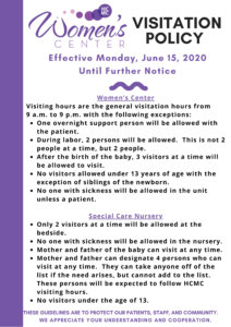 - Visitation will only be allowed between 10 a.m. – 11 a.m., 5:30 p.m. – 6:30 p.m., and 8 p.m. – 9 p.m. each day.
