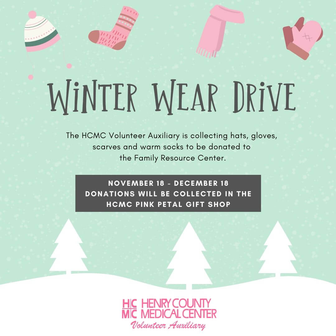 Paris, TN – Henry County Medical Center’s Volunteer Auxiliary is collecting winter wear for the Henry County Family Resource Center during the month of December. The Auxiliary is asking for donations of warm hats, gloves, scarves, and socks.